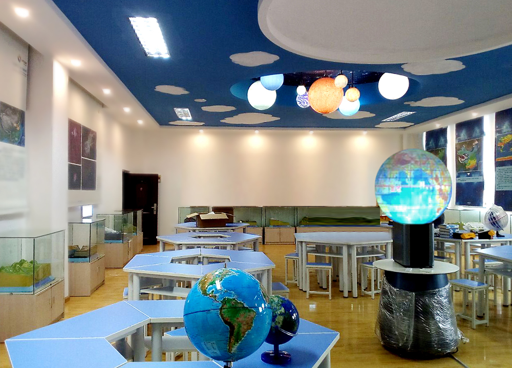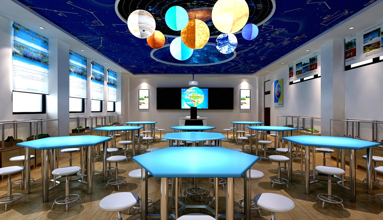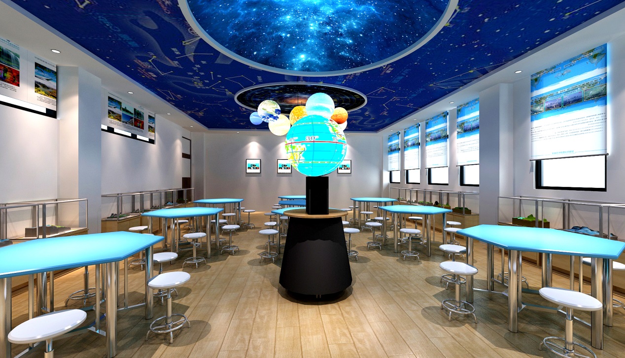 該教室占地102.25平方米,風格上依然延續(xù)藍白風,設(shè)計簡約又充滿科技感。與以往專用地理教室相比,教室吊頂層不僅有宇宙星空演示用的天文穹頂,還增加了懸掛式立體太陽系星球,在燈光的襯托下仿佛置身于其中,宇宙的無窮奧秘等著你去探索,這種情境式的教學環(huán)境能夠使學生快速進入學習地理的狀態(tài),提高課堂效率。