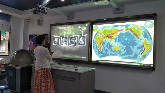 數(shù)字立體地形作為羿飛地理專用教室的核心設(shè)備,貫穿整堂課,因而功能更為全面。它將中國、世界立體地形、教學(xué)PPT、Flash動畫、白板融于一體。將畫面投影到中國及世界立體模型上,讓學(xué)生更直觀地感受到地形、河流、溫度帶、氣候等地理信息。結(jié)合數(shù)字化的課程內(nèi)容,可以在立體模型上進(jìn)行動態(tài)演示,如風(fēng)帶的形成過程等。