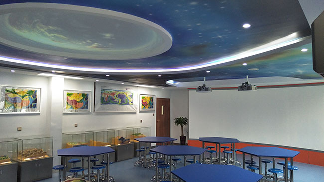 天文演示儀有效利用教室的有限空間,在天花板上為學(xué)生創(chuàng)造了一個“仰望星空”的童話。將學(xué)生的視角由地球范疇轉(zhuǎn)向太空乃至整個宇宙,將地理知識與天文教學(xué)有效的整合,使學(xué)生了解地月系、地球與太陽系、地球與銀河系之間的關(guān)系,了解恒星、行星的形成及宇宙的演變過程。