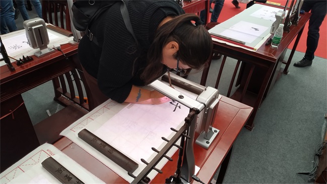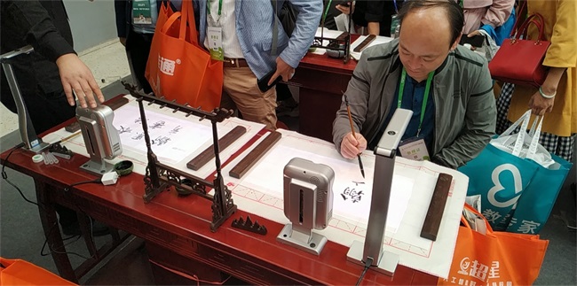在展會(huì)現(xiàn)場,參觀者在翰墨派書法教學(xué)系統(tǒng)的指導(dǎo)下完成一幅書法寫作,還能領(lǐng)取一份精美禮品,大家躍躍欲試,活動(dòng)參與者眾多,親自感受了一把揮毫潑墨的樂趣。