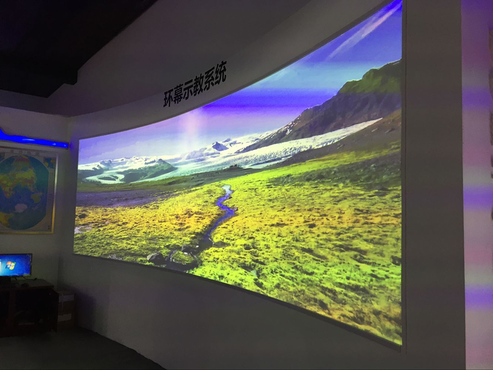 環(huán)幕示教系統(tǒng)比普通的標準投影系統(tǒng)具備更大的顯示尺寸、更寬的視野、更高的顯示分辨率,以及更具沖擊力和沉浸感的視覺效果。用于播放宇宙和地球、自然環(huán)境和人類社會、區(qū)域地理環(huán)境和可持續(xù)發(fā)展、海洋地理、旅游地理、城鄉(xiāng)規(guī)劃、自然災難與環(huán)境保護等,給學生以良好的視覺沖擊力,和沉浸感。